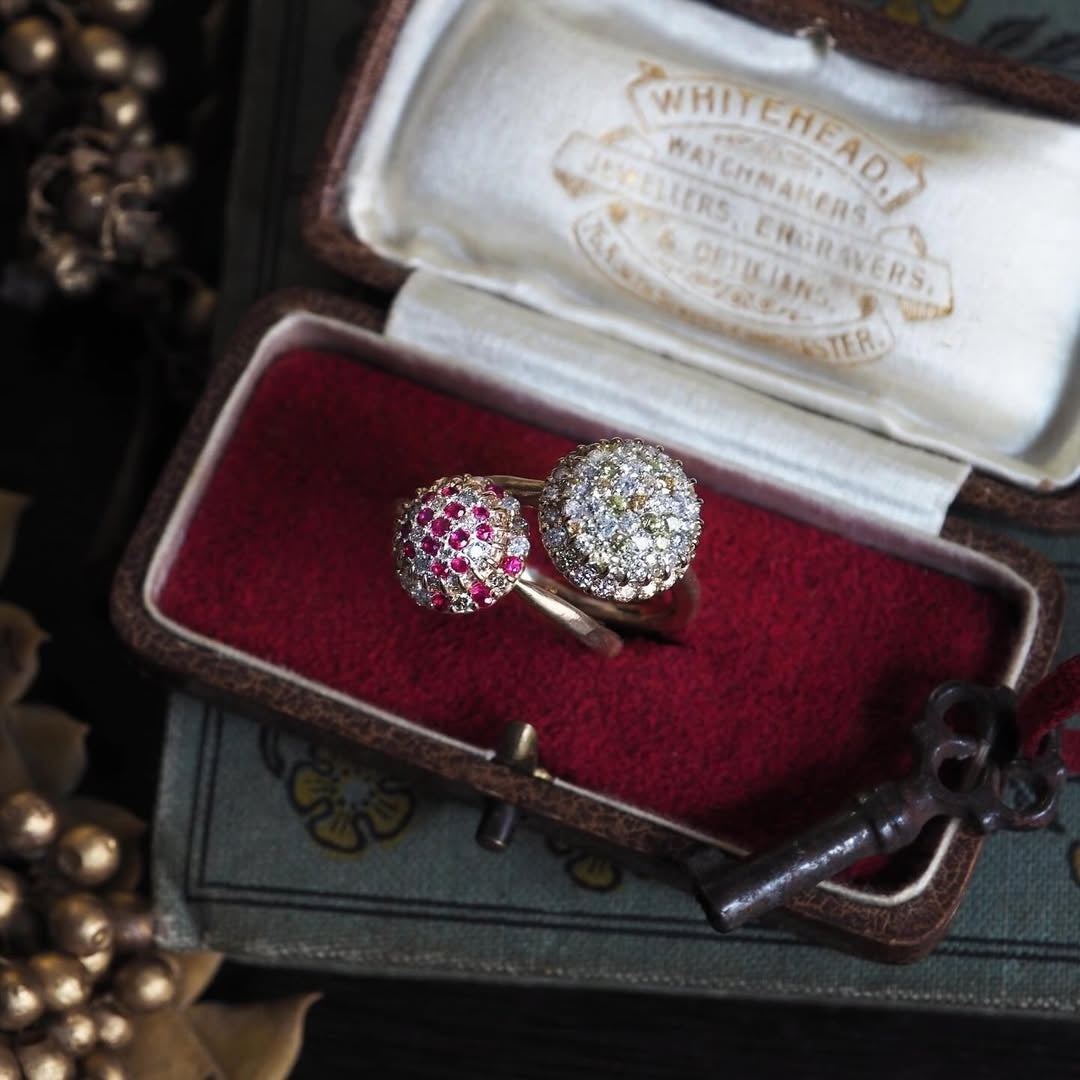 サイズや石の並び、色の流れがすべて異なるリングは、いずれも一点もの。一本で装いの主役になる存在感はもちろん、重ね着けによって印象が変わるのもサンクルールならではの楽しみです。