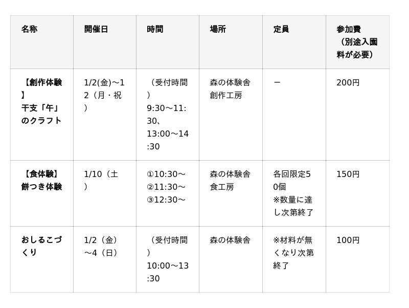お正月も楽しい体験イベントを実施します。炭火でお餅を焼き、体がほっこり温まるおしるこを作る「おしるこづくり」、まつぼっくりや小枝、木の実などの自然素材で今年の干支「午」を作る「干支『午』のクラフト」、臼と杵を使った本格的な餅つきを楽しみ、つきたてのお餅を味わえる「餅つき体験」などをご用意しています。お子さまから大人まで楽しめる内容で、お正月の思い出づくりに最適です。