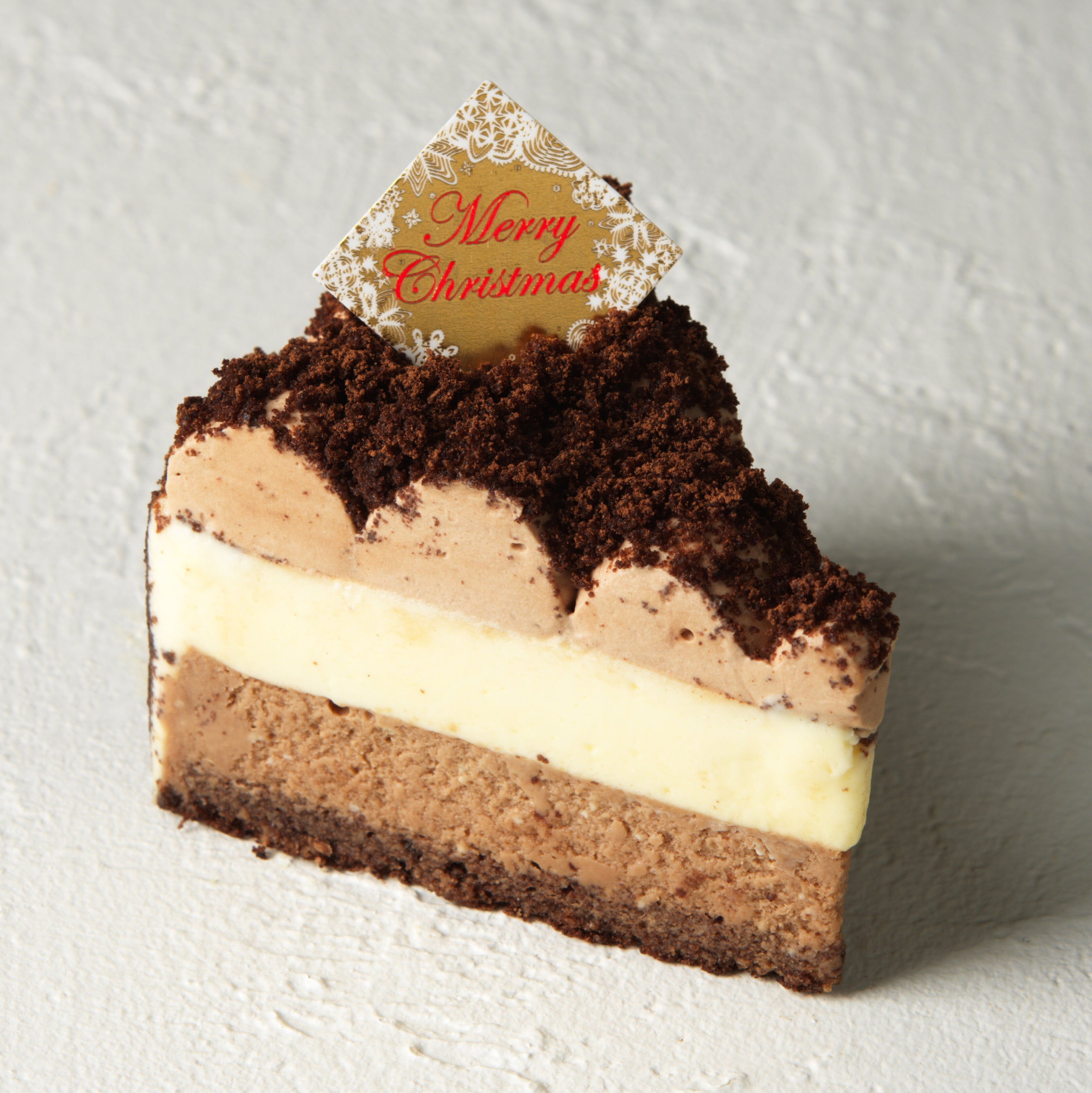 芳醇なチョコレートとクリームチーズを合わせたショコラベイクドチーズケーキとミルキーなマスカルポーネムースが絶妙に調和したチーズケーキです。ムースには深いミルク感とすっきりとした後味が特徴のイタリア産マスカルポーネチーズを使用。チョコレートと2種のチーズが引き立てあいながらとろけます。この時期だけの華やかなクリスマスピックを添えてお届けします。