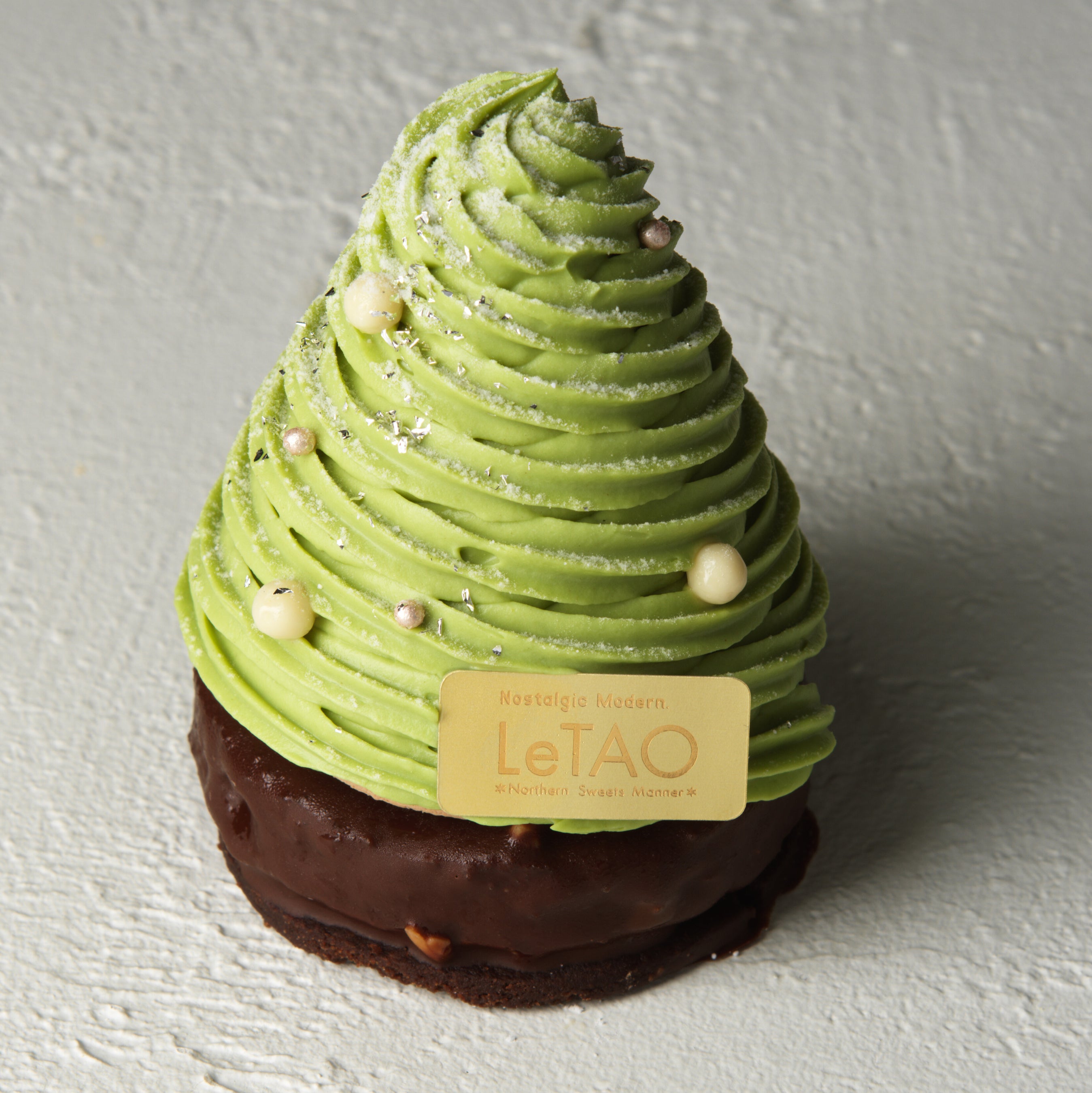 サクサクとしたチョコレートサブレに、しっとりとしたチョコスポンジと奥深い味わいのミルクチョコムース、生クリームを重ね、濃厚なピスタチオクリームでモミの木のように飾り付け、中には甘酸っぱいグリオットジュレをしのばせ、さっぱりとした後味に仕上げました。雪のように降り積もる、アラザンやチョコパフの食感もお楽しみいただけます。