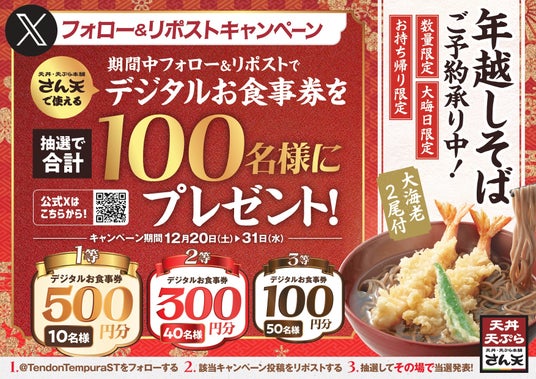 サトフードサービス株式会社(本社・大阪府大阪市、代表取締役社長・杉本 貴之)が運営する「天丼・天ぷら本舗 さん天 」では、2025年12月20日(土)~12月31日(水)まで、天丼・天ぷら本舗 さん天で使える「デジタルお食事券」がその場で合計100名様に当たる、お得なXキャンペーンを開催します。天丼・天ぷら本舗さん天のX公式アカウントをフォローし、キャンペーンポストをリポストすることで「デジタルお食事券」は500円分が10名様、300円分が40名様、100円分が50様に当たる抽選にご参加いただけます。本お食事券は期間限定商品や各種天丼をはじめ、「天丼・天ぷら本舗 さん天」の各店舗でお食事をしていただく際にご利用いただけます。
