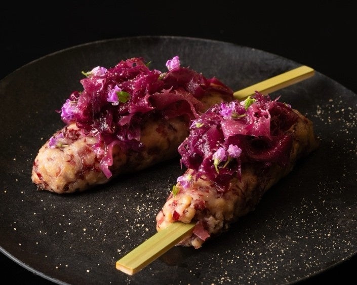 未利用食材はもちろん、生物多様性のキーとして注目されている海藻やキロメートル・ゼロの野菜を使用した「8年後の当たり前」がテーマのコースを提供。環境再生を掲げる「椎茸のグラタン」は、森林資源を生かして育てた群馬・熊本産の椎茸を使用。海藻の新たな価値を示す「海藻とタコのつくね」には、海藻で海の安全を守りながら新しい食文化を提唱する熊本県 天草市シーベジタブルのとさかのりや持続可能な漁法で獲れたミズダコを合わせる。その他、産卵後のチョウザメや島根県 奥出雲市 熟豊ファームの「サステナブル和牛熟」を使用しながらも、味わいに妥協することなく“誰が食べてもきちんと美味しい”コース料理を提供。