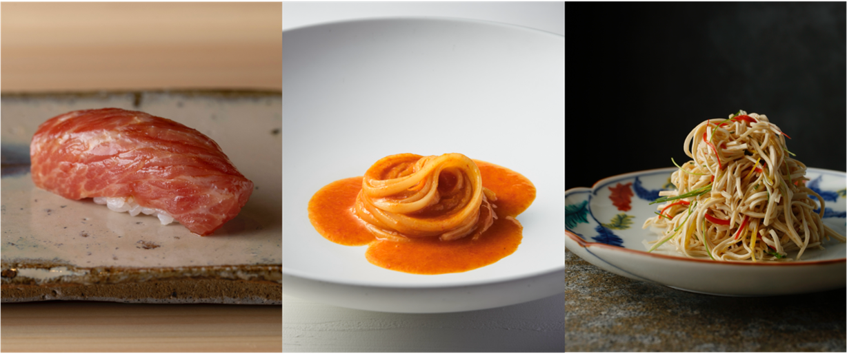 画像:左/みつい 「鯨の尾の身 握り」中央/PRIMO PASSO「リングイネ トマト」右/KOBAYASHI 拌干絲(パン・ガンスー)