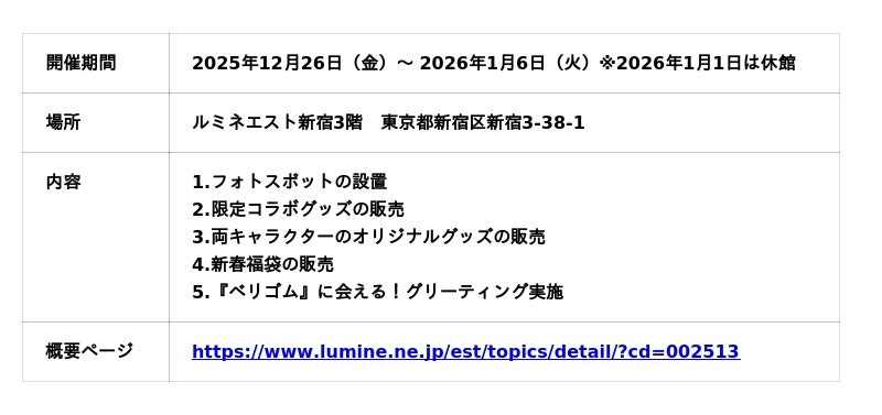 株式会社テレビ東京コミュニケーションズ(本社:東京都港区、代表取締役社長:福田一平、以下「TXCOM」)と、株式会社ロッテホールディングス(本社:東京都新宿区、代表取締役社長CEO:玉塚 元一、以下「ロッテホールディングス」)は、「新宿ルミネエスト」にて、2025年12月26日~2026年1月6日の期間、韓国の人気キャラクター『WASABI BEAR(ワサビベア)』と『BELLYGOM(ベリゴム)』 がコラボレーションしたポップアップイベント「Happy New Bear! BELLYGOM × WASABI BEAR 2025→2026」を開催しますのでお知らせいたします。