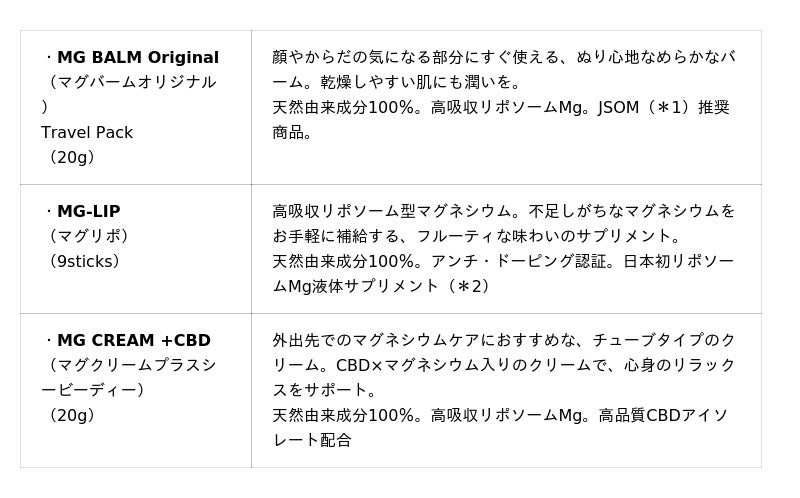 商品は左から「MG BALM Original Travel Pack」、「MG-LIPO」、「MG CREAM +CBD」
