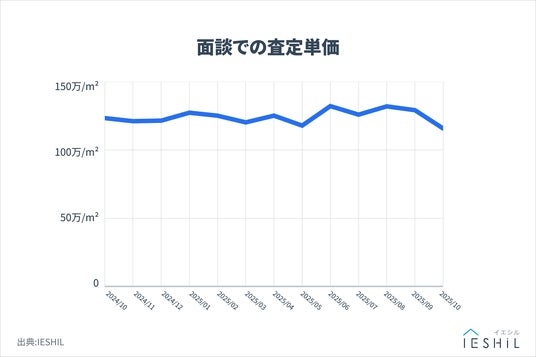 直近1年間に東京都内の物件を対象に行われたIESHIL査定依頼データを分析したところ、平方メートル 単価ベースでの査定額推移は「ほぼ横ばい」という結果になりました。不動産査定の主流である「取引事例比較法」は、過去の成約事例を基礎として算出されます。つまり、売り出し価格が期待値先行で上昇を続ける一方で、実際の成約に基づいた客観的な市場価値は、踊り場に差し掛かっているという実態が浮き彫りになっています。