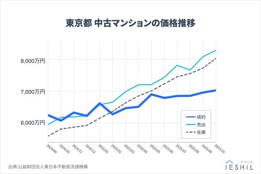 公益財団法人東日本不動産流通機構のデータによると、東京都においては2024年10月から2025年10月にかけて首都圏の中古マンションの平均売出価格は、6,184万円から8,282万円とおよそ34%上昇しています。これは大幅な上昇率を記録した2024年10月度の平均成約価格の前年比がおよそ22%だったことを鑑みても、より大幅な上昇率と言えます。