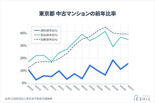 同時に、中古マンションの在庫数も上昇を続け、前年比38%を記録するなど増加の一途を辿っており、経済的な不均衡が起きていると見受けられます。