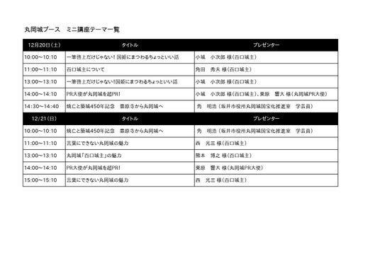 百口城主4名と市の学芸員、そして丸岡城PR大使に就任した”お城博士ちゃん”こと栗原響大さんをお招きします。各回、定員は10名で、丸岡城ブースにて整理券を配布します。