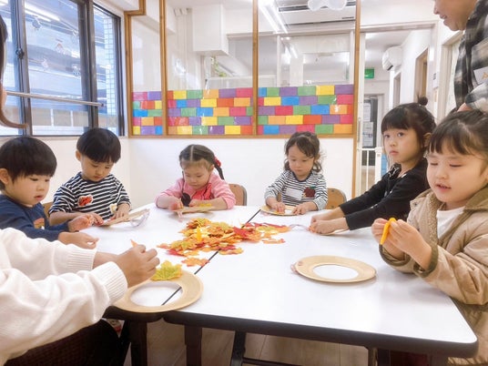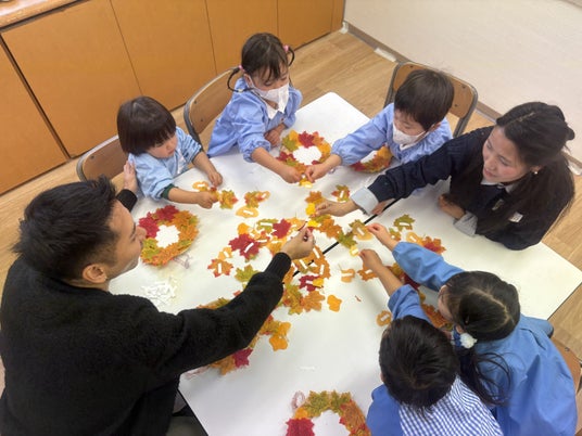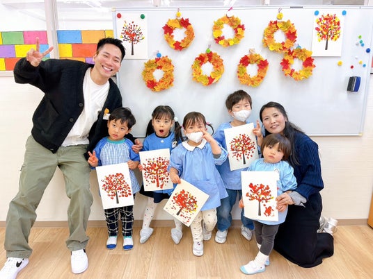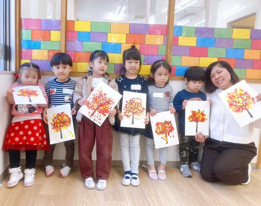 英語を使って、サンクスギビングと秋をテーマにしたクラフトを楽しみました。指を使って、絵の具で木に秋色の葉っぱをイメージしながら色をつけるフィンガープリントやカラフルなリースをつくったりと、アートを通してモータースキルと英語にふれる時間になりました。