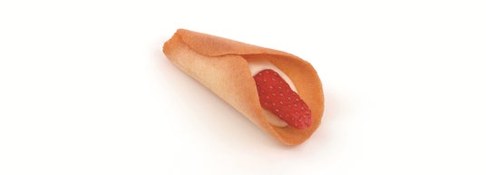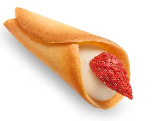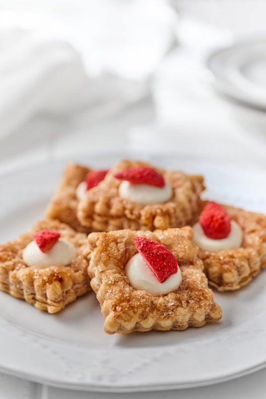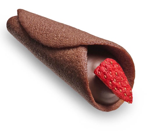 香ばしくバターの香り高いパイ生地にするため、何層にも重ねたパイ生地にザラメをかけじっくり焼き上げました。焼き上げたパイ生地の中心にホワイトチョコレートを絞り入れ、フリーズドライ苺を飾りました。