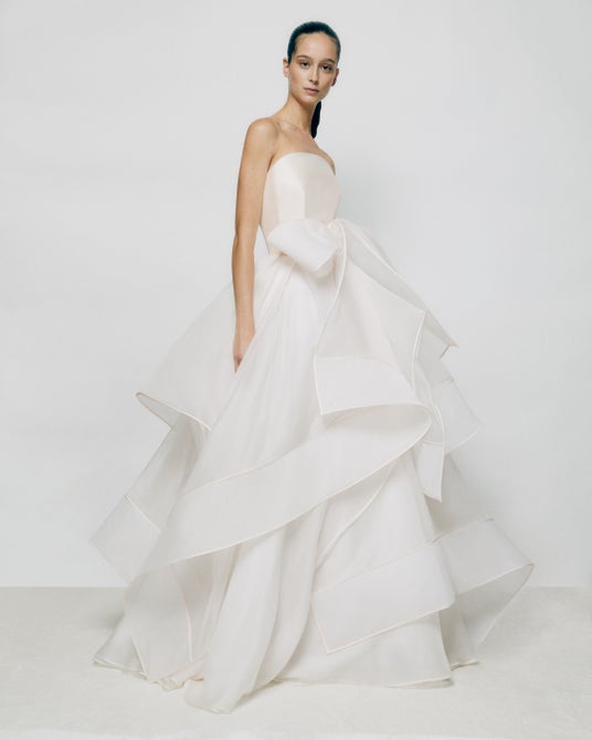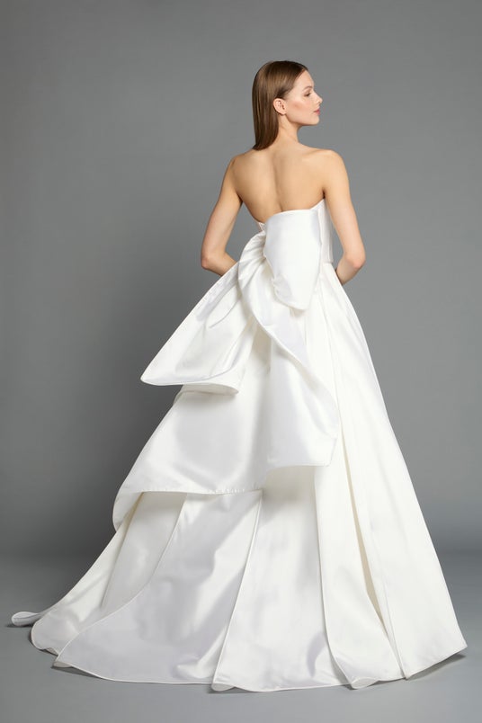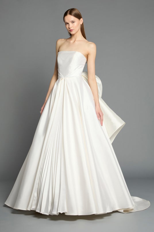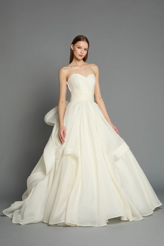 クリーンなハートカットのトップに対し、スカートの流れるような立体ドレープが建築的で、都会の優雅さとクラシックな気品が美しく調和する一着。動くたびに空気を含んで表情を変えるシルエットが、花嫁の存在感を際立たせます