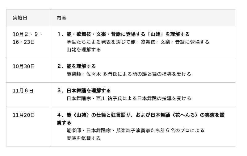 統芸能で描かれる「山姥(やまんば)」をテーマに研究発表を行いました。続いて、プロの能楽師と日本舞踊家から能と日本舞踊の実技の指導を受け、最終回に「能〈山姥〉の仕舞と狂言語り」および「日本舞踊〈花へんろ〉」の実演を鑑賞しました。