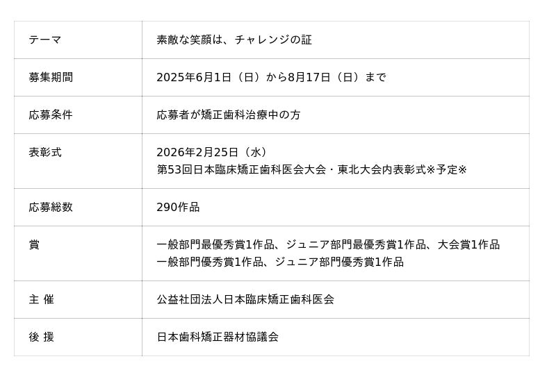 矯正歯科専門開業医の全国組織である日本臨床矯正歯科医会(会長:土屋 朋未)は矯正歯科治療中の方を対象とした笑顔のフォトコンテスト「第21回ブレーススマイルコンテスト」の受賞作品を決定しました。