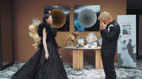 お色直しではシックで印象的な黒のドレス姿に変身したあみさん。こうへいさんは一目見た瞬間その美しさにのけぞり、「ドレスを着たあみは最強でしたね。普段からキレイなんですけど、やっぱり花嫁姿は改めて世界で一番きれいだなと感じました」と語ってくれました。