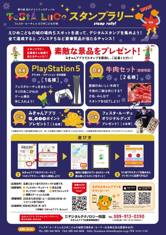 賞品:PlayStation 5 デジタル・エディション 日本語版(1名)/愛媛県産牛肉セット(2名)/みきゃんアプリ5,000ポイント(3名)/フェスタ・ルーチェ オリジナルグッズ(4名)/ほか