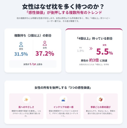 女性は睡眠の質に加えて「肌へのやさしさ」「インテリアとしての統一感」「季節ごとの素材選び」など感性価値を重視する傾向が強く、これが複数所有を後押ししていると考えられます。
