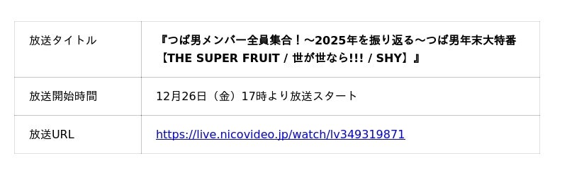 ニコニコ生放送では、年末より「つばさ男子プロダクション」による特別プログラム(全5番組)を放送いたします。 番組には、今年メジャーデビューを果たし、幕張メッセ単独公演も大盛況に終えた「THE SUPER FRUIT」、5ヶ月連続リリースや大阪移住プロジェクトなど多角的な活躍を見せた「世が世なら!!!」、そして来年1月28日に待望のデビューシングル発売を控える平均年齢16歳の新星「SHY」の3グループが生出演。 つば男メンバーとともに、賑やかな年末年始をお楽しみください!