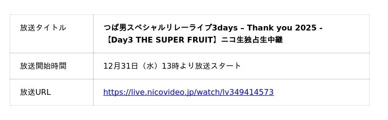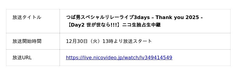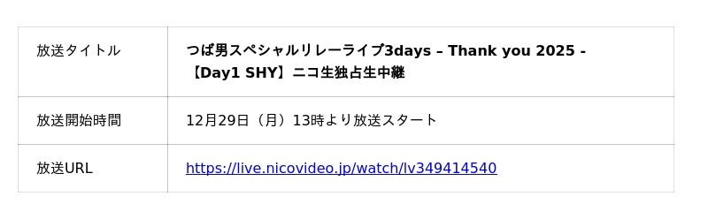 「つば男スペシャルリレーライブ3days-Thank you 2025-」をニコニコ生放送にて独占生中継!