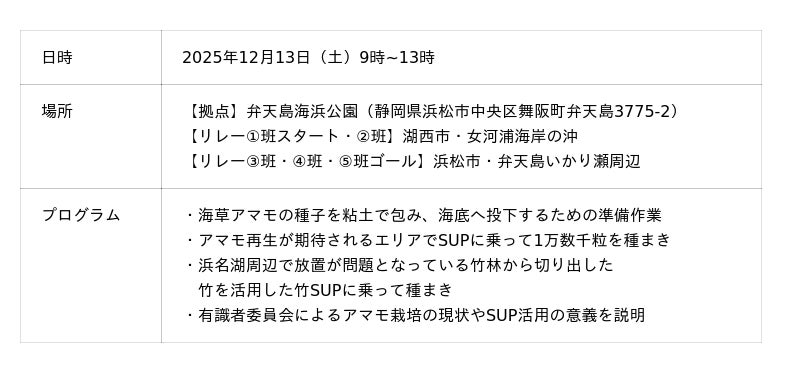 一般社団法人 静岡UP 浜名湖ワンダーレイク・プロジェクトは、2025年12月13日(土)、浜名湖で9年頃前から急減して生態系に影響を与えている海草アマモを復活させるため、人気のマリンアクティビティSUPを活用して、海上からの種まきを実施しました。海洋冒険家・鈴木克章さん(浜松市)、浜名湖周辺や静岡市のSUPインストラクター、パドラーたちが多数参加。地元SDGs推進企業や、将来水族館職員をめざす専門学校生、地元高校のSUP部員たちなど、総勢約60名が参加して、リレー形式で実施しました。