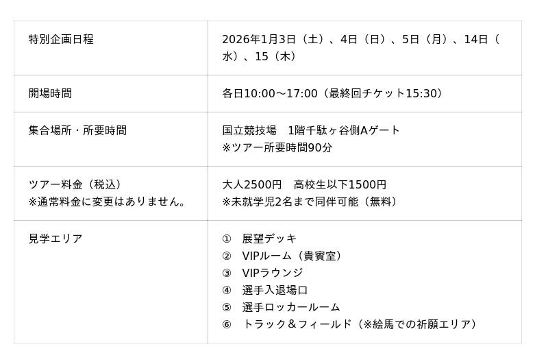 新年を祝う特別企画として、1月3日(土)、4日(日)、5日(月)、14日(水)、15(木)の5日間限定で、「 “聖地” MUFG国立 祈願ツアー」を開催いたします。