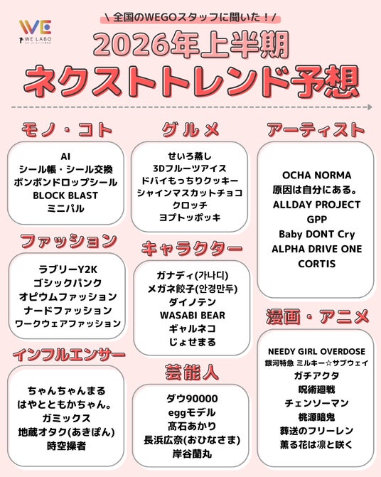 また、界隈別トレンドランキングと合わせて公開される、全国約180店舗のWEGOスタッフへの大規模アンケートによる「【次流行る】2026年上半期ネクストトレンド大調査!WEGOスタッフに聞いてみた」では、グルメや漫画・アニメ、インフルエンサーなど、あらゆるジャンルから「次に来る!」と注目されるコンテンツをたっぷりご紹介しています。