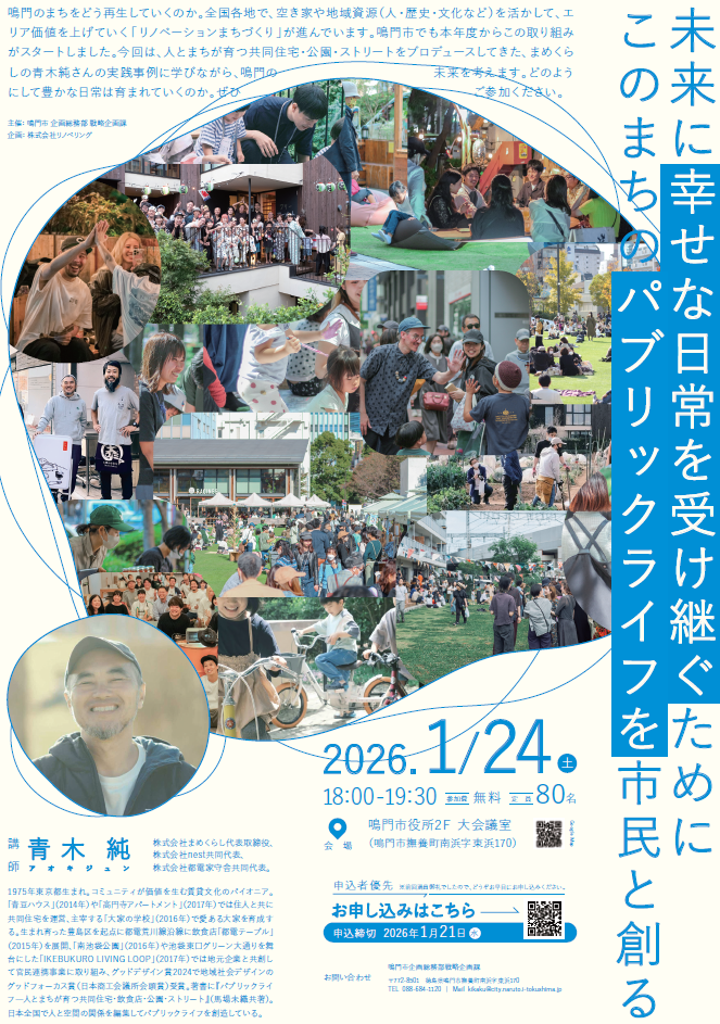 鳴門市でも今年度よりこの取り組みを開始しており、具体的な実践事例を学ぶべく、全国各地で人とまちが育つ公園・ストリートなどをプロデュースしてきた講師を招き、講演会を実施します。