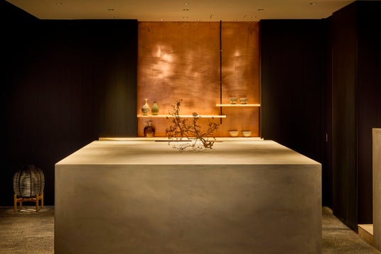 ・レセプション職人による左官仕上げの趣あるカウンターが印象的なレセプションです。その隣にはスタイリッシュな茶房カウンターがあり、静かな佇まいがゲストをそっと導き、穏やかにお迎えします。