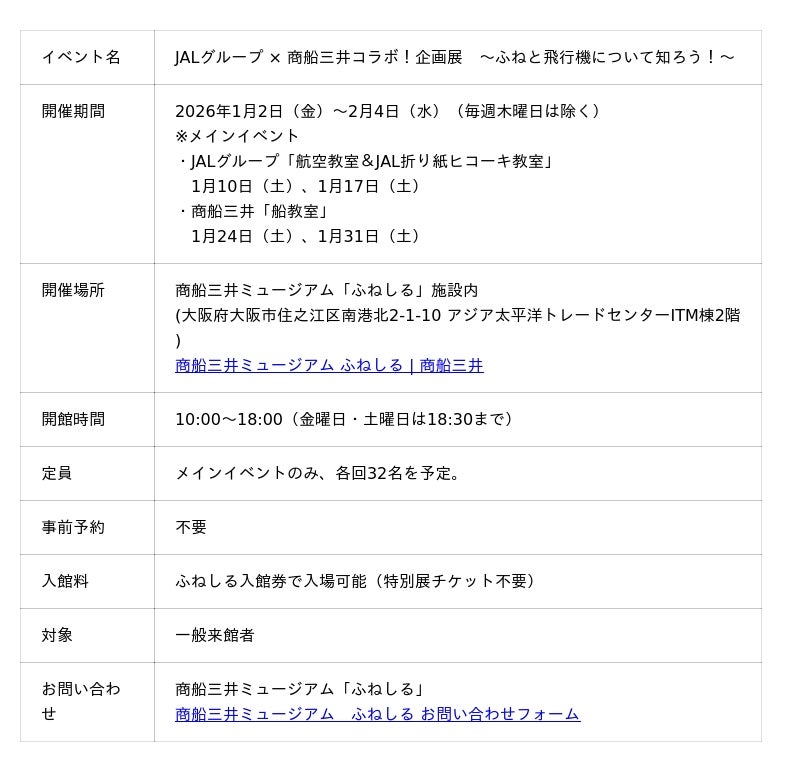 株式会社商船三井(社長:橋本 剛、本社:東京都港区、以下「当社」)は、商船三井ミュージアム「ふねしる」(註)において、空と海の仕事を楽しく学べる特別展『JALグループ × 商船三井コラボ!企画展~ふねと飛行機について知ろう!~』を、2026年1月2日(金)から2月4日(水)まで開催します。本特別展はJALグループとのコラボレーションにより「飛行機のこと」と「船のこと」を同時に楽しく学べるイベントです。飛行機・船の模型や制服展示、運航乗務員や船長による教室に加え、JALコラボグッズの販売も決定致しました。ここでしか体験できないプログラムが満載です。