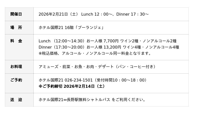 \一日限定!/信州の冬を彩る食とワインの饗宴ホテル国際21×サンクゼール 初のコラボイベント開催