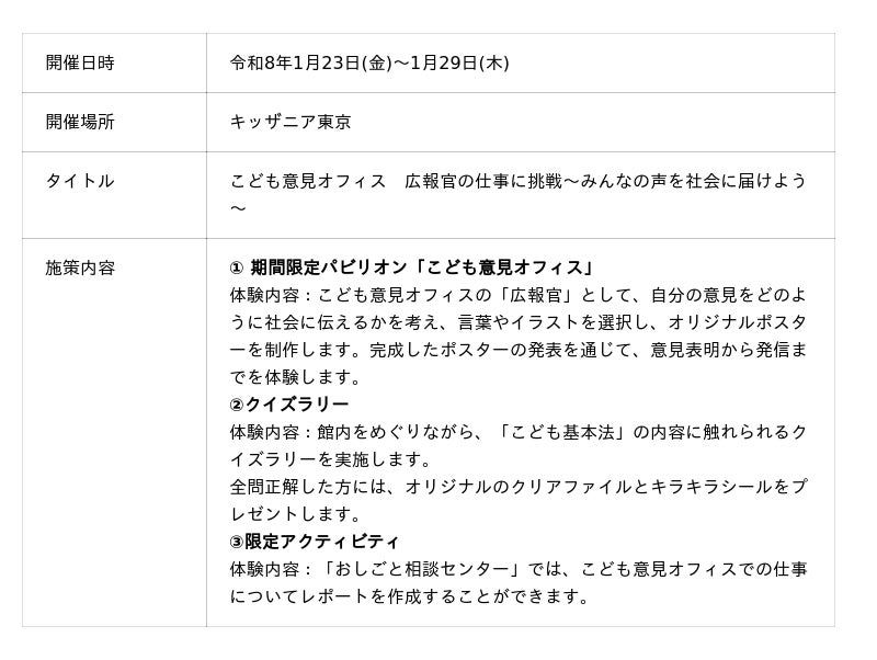 令和8年1月23日(金)~1月29日(木)の期間、こども家庭庁はキッザニア東京(東京都江東区)において、期間限定イベント「こども意見オフィス 広報官の仕事に挑戦~みんなの声を社会に届けよう~」を初開催します。本イベントでは、広報官として「こども若者★いけんぷらす」の広報ポスター制作に取り組み、自分の思いを社会に伝える体験を楽しく学ぶことができます。また、同時開催のクイズラリーでは、「こども基本法」をテーマに、クイズを解きながら楽しく内容を理解することができます。
