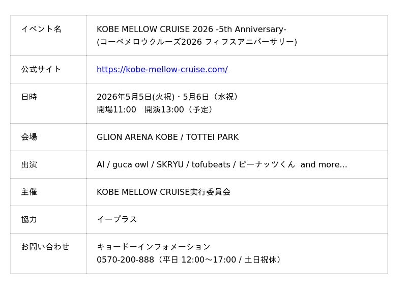 株式会社One Bright KOBE(住所:神戸市中央区、代表取締役社長 渋谷 順)は、2026年5月5日(火祝)と6日(水祝)の2日間、GLIONARENA KOBE及びTOTTEI PARKにて、都市型野外音楽フェス『KOBE MELLOW CRUISE 2026-5th Anniversary-』を開催します。