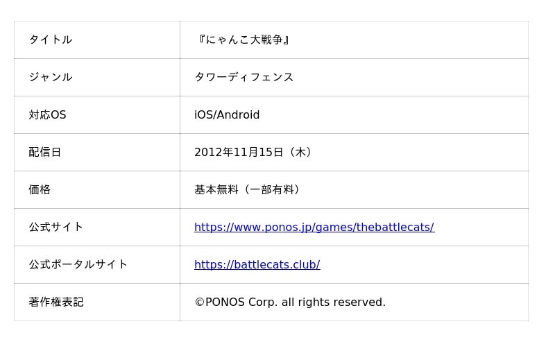 『にゃんこ大戦争』は、iOS・Android向けタワーディフェンスゲームです。プレイヤーは様々な能力を持つ「にゃんこ」たちを編成して、各地を侵略していきます。2012年のリリース以来、個性的なキャラクターや独特の世界観が、日本のみならず世界中の多くのお客様にご支持をいただいています。今後も多様なメディア展開やコラボレーションを積極的に行ってまいります。