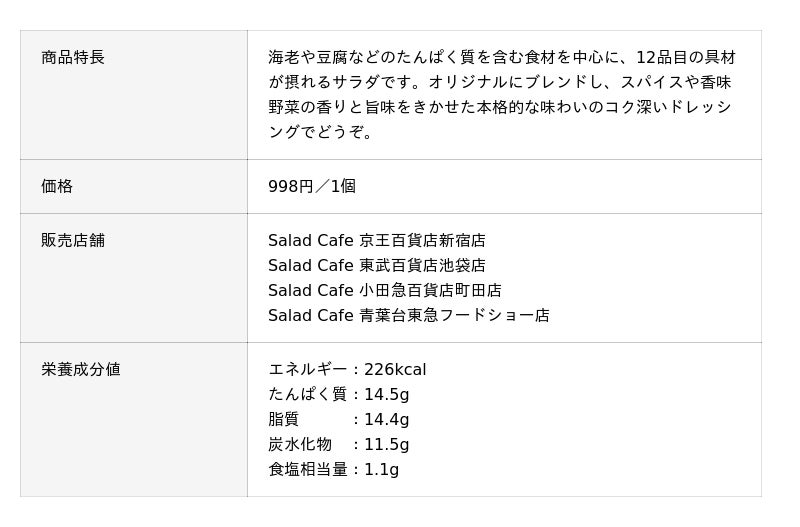 『きれいをつくる12品目のコブサラダ』は、海老、豆腐、ゆで卵といったたんぱく質を含む食材を中心に、ブロッコリー、きゅうり、紫キャベツ、赤パプリカ、レタスなどの野菜を合わせた、12品目の多彩な具材が摂れるサラダです。彩りや1パックで満足できるボリューム感にこだわりました。具沢山のサラダによく合う、濃厚でクリーミーなコブドレッシングは、香辛料のきいたスパイシーな味わいが楽しめます。高まる健康志向のニーズに応えるだけでなく、具材の豊富さや彩りの良さなどサラダカフェのこだわりを手軽なパックサラダとしてお楽しみいただけることから、今年4月の発売以来ご好評いただいています。