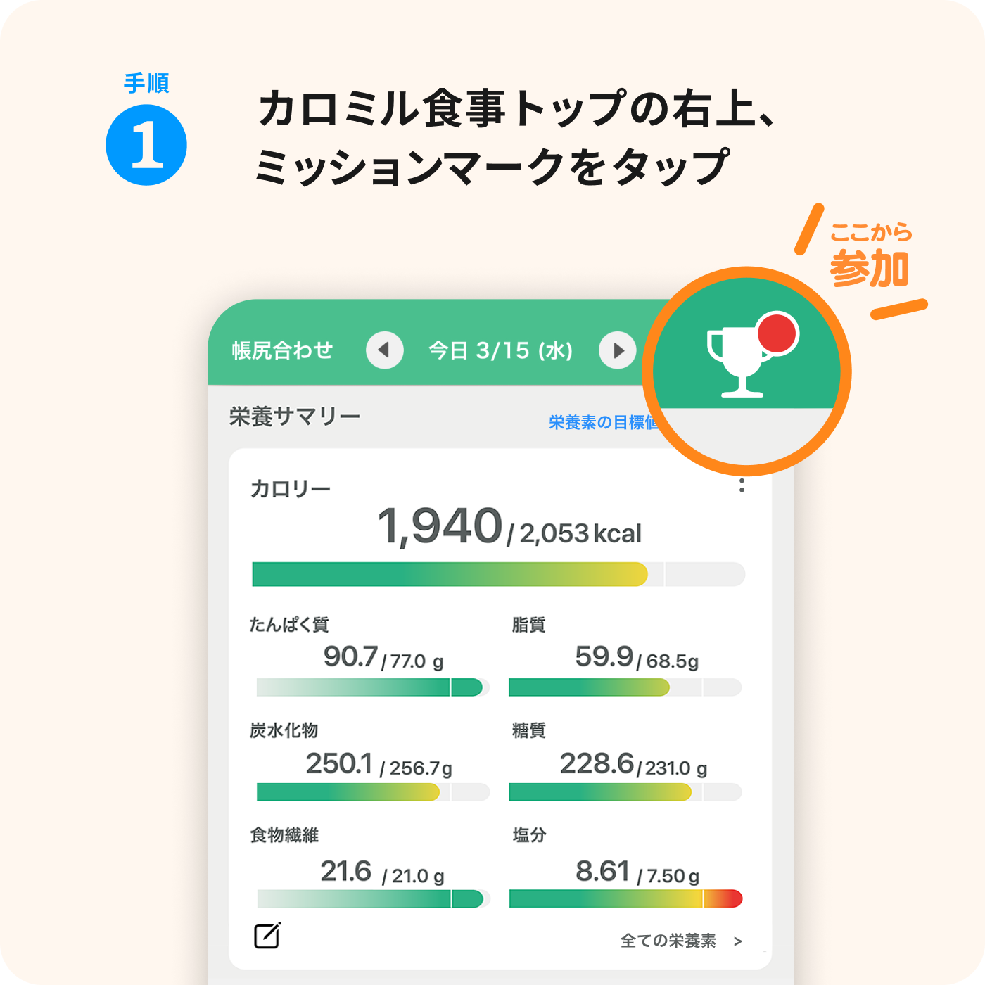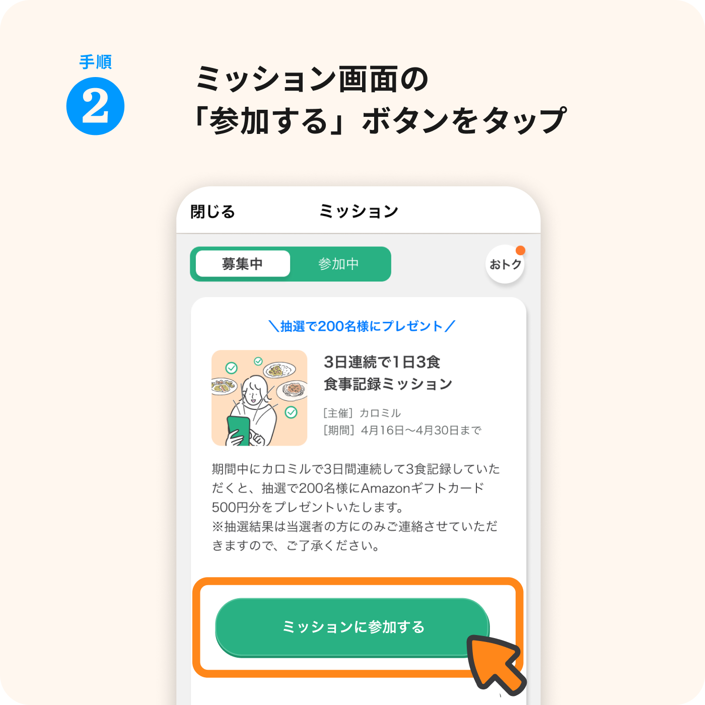 1.カロミルアプリ内のミッションより、参加ボタンをタップ