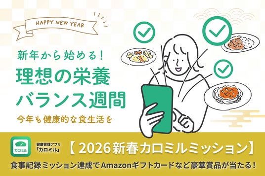 食事・運動・体重管理アプリケーション(以下アプリ)「カロミル」の開発・提供をするライフログテクノロジー株式会社(東京都中央区、代表取締役:棚橋繁行、以下当社)は、2026年1月19日(月)よりカロミルユーザー向けイベント「新年から始める!理想の栄養バランス習慣」食事記録ミッションを開催します。本イベントに参加してくださった方々には、抽選でAmazonギフトカードのほか、新年を健康に過ごしていただける豪華賞品が当たります。