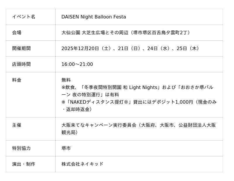 株式会社ネイキッド(本社:東京都渋谷区、代表:村松亮太郎)は、「大阪来てな!キャンペーン」の一環として、2025年12月20日(土)・21日(日)・24日(水)・25日(木)の4日間限定で大阪府堺市・大仙公園にて開催中の夜間イベント「DAISEN Night Balloon Festa」(主催:大阪来てなキャンペーン実行委員会(大阪府、大阪市、公益財団法人大阪観光局))のプロジェクションマッピングショーならび空間・体験演出を手がけましたことをご報告いたします。本イベントは、大阪唯一の世界遺産「百舌鳥・古市古墳群」の構成資産である仁徳天皇陵古墳に隣接する大仙公園を舞台に、光・映像・体験型アートを通じてナイトウォークして楽しむ特別企画です。