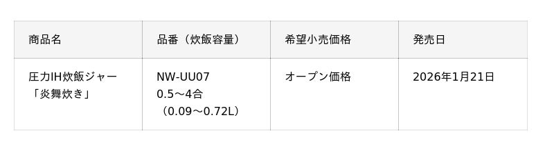 象印マホービン株式会社は、複数に分割した底IHヒーターの出力を上げることで、更なるおいしさを実現した、コンパクトながら4合まで炊飯できる圧力IH炊飯ジャー「炎舞炊き」(NW-UU07)を2026年1月21日より発売いたします。