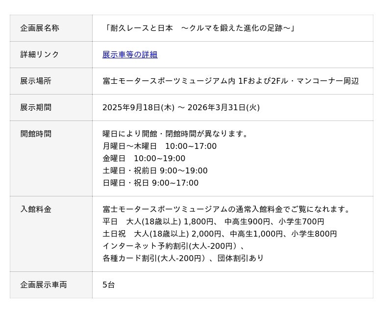 富士モータースポーツミュージアムでは、日本車の耐久レースへの挑戦をテーマとした企画展「耐久レースと日本 ~クルマを鍛えた進化の足跡~」を、2025年9月18日から2026年3月31日まで開催しています。今回、追加展示として、12月25日(木)から「童夢-零(ゼロ)」の展示を開始します。