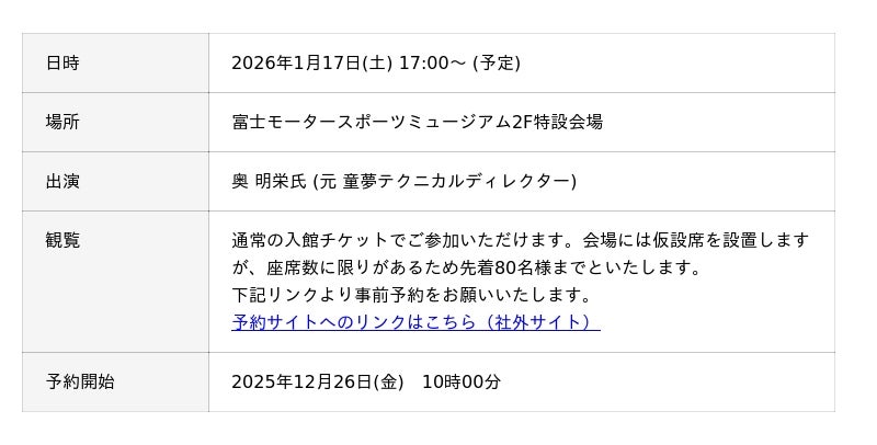 また、2026年1月17日(土・予定)には2台の実車を前に、2台の開発に直接かかわり、その後、童夢のテクニカルディレクターを務めた奥 明栄氏を迎え、童夢の歴史を振り返るトークショーを開催します。2月以降も、耐久レース展にちなむ関係者をお招きして、トークショーを予定しています。ご期待ください。