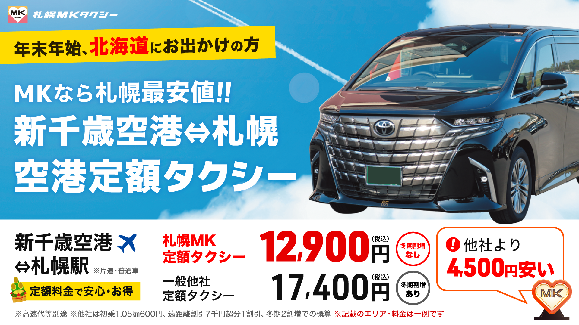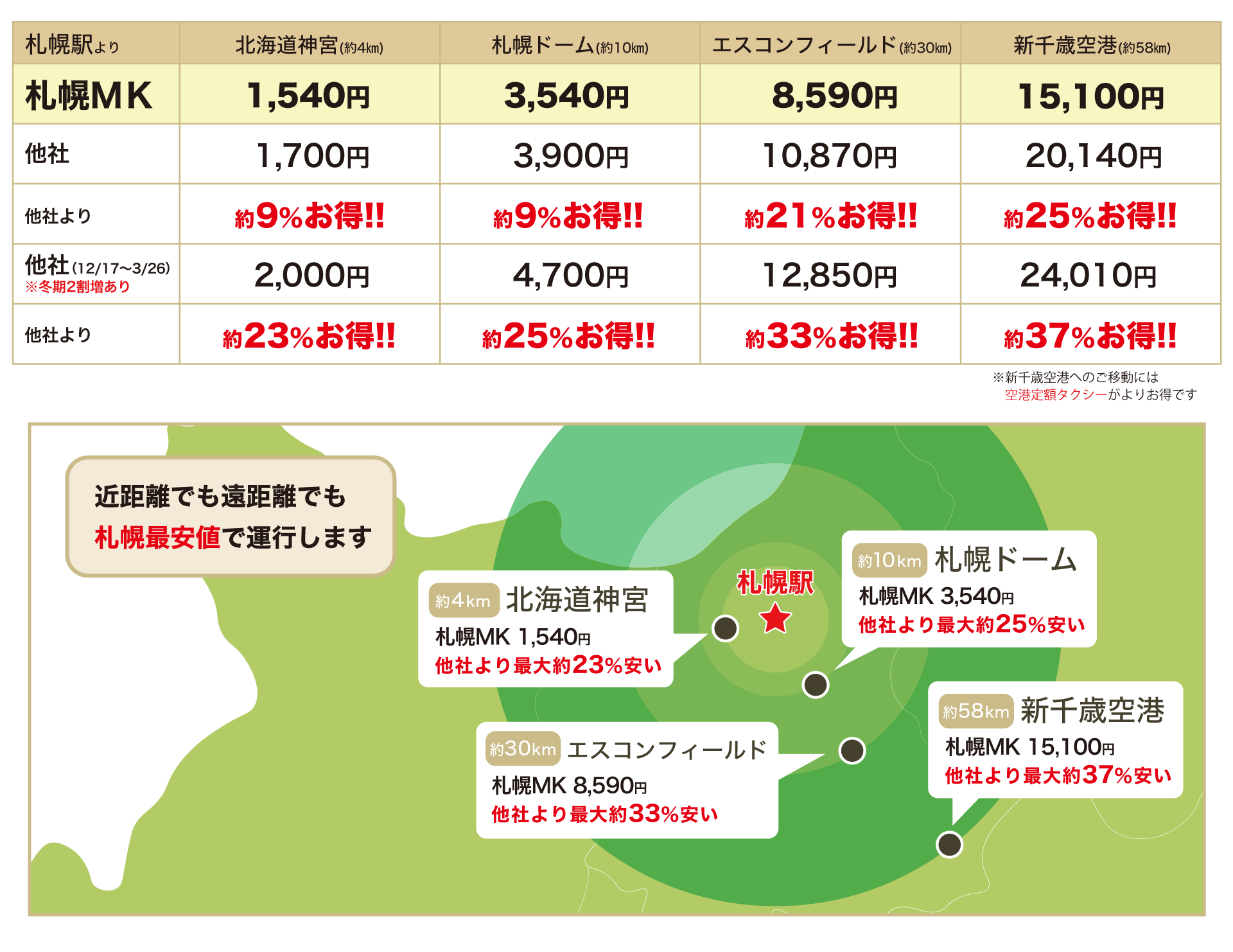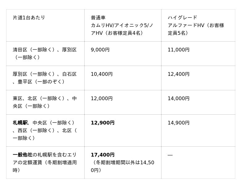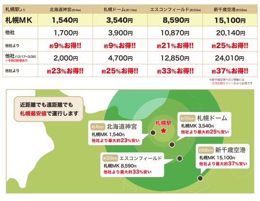 札幌駅を含むエリアでは、一般他社が冬期割増時17,400円に対して札幌MKが12,900円と26%もお得です。冬期割増時以外も一般他社14,500円に対し札幌MKが12,900円で11%お得です。