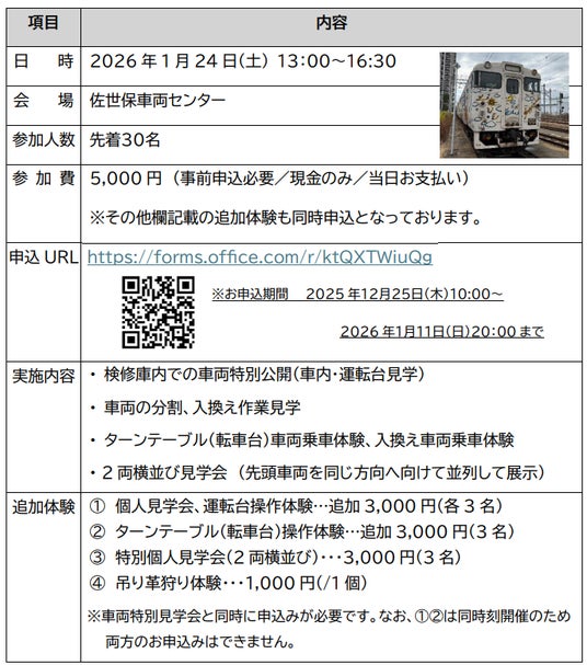 開 催 日 : 2026年 1 月 24 日(土)・25 日(日)会 場 : 佐世保車両センター(特別見学会) / 早岐駅~江北駅~諫早駅(ラストラン)