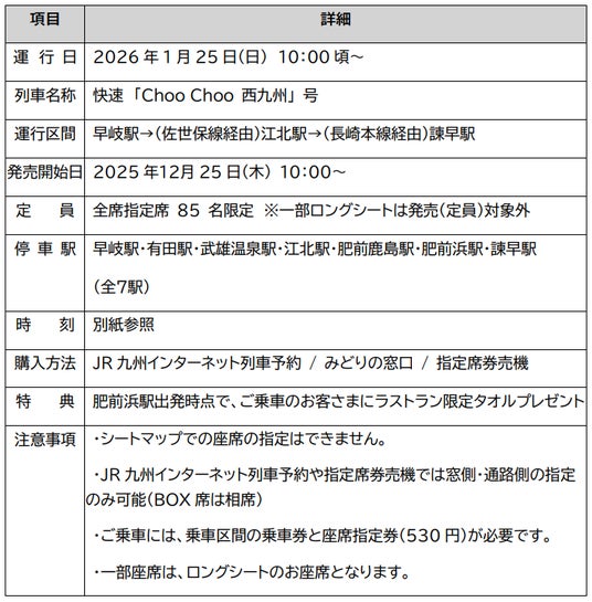 JR 九州では、2026 年 1 月 24 日(土)から 25 日(日)にかけて、「Choo Choo 西九州 TRAIN」 のラストランプロジェクトを実施します。 2022 年 9 月 23 日の西九州新幹線開業に合わせて運行を 開始した同車両は、EXILE TAKAHIRO 氏によるデザインに沿線小学生がペイントをすることで誕生 しました。佐賀・長崎の両県で愛され、親しまれた特別な車両がラストランを迎えるにあたり、車両特別 見学会とラストランを実施します。 車両特別見学会ではキハ 47 形「Choo Choo 西九州 TRAIN」 の先頭車同士の並列展示や、車両センターならではの体験、また、車両ライトアップなどを実施します。 ぜひこの特別なイベントにご参加ください。