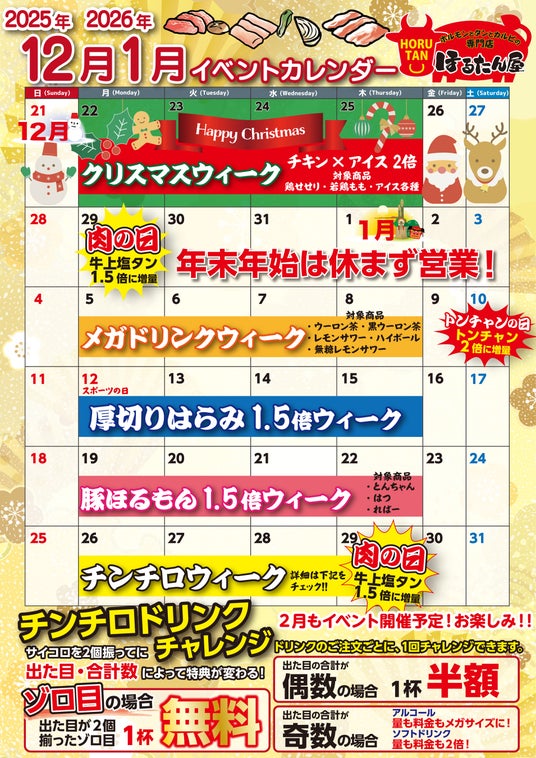 【ほるたん屋】イベントカレンダーが復活! 年末年始は毎週月~木がお得に楽しめる限定イベントを開催