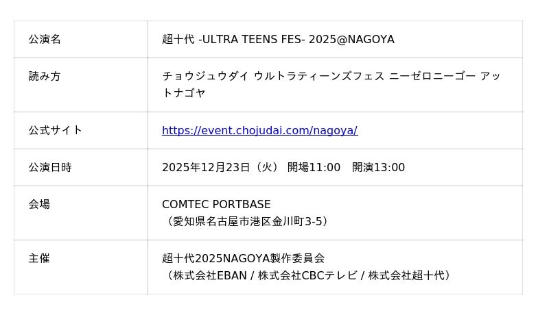 超十代2025NAGOYA製作委員会は、2025年12月23日(火)に『超十代 -ULTRA TEENS FES- 2025@NAGOYA』をCOMTEC PORTBASE(名古屋市港区)にて開催いたしました 。今年で2度目となる名古屋開催では、「さぁ、未来を変えようぜ。」をテーマに掲げ、日本の若者の中心である「超十代」メンバーが名古屋に再集結 。 リアル会場への来場者1,500人以上!オンライン配信総視聴者数233,855人を記録しました。MCにはお馴染みの大倉士門、山之内すずに加え、地元CBCテレビのアナウンサー友廣南実、山内ともなが登場し、イベントの幕開けを宣言しました。