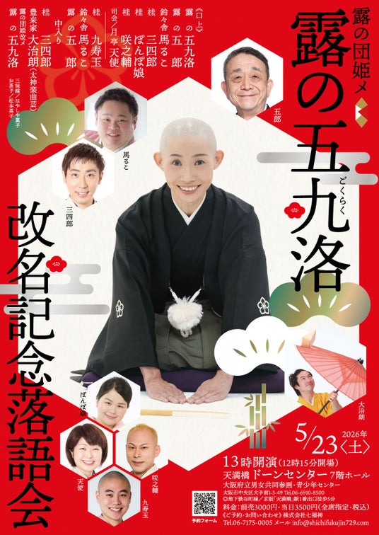 2026年5月23日(土)にはドーンセンター(大阪市)で「露の団姫改メ露の五九洛改名記念落語会」を開催する。