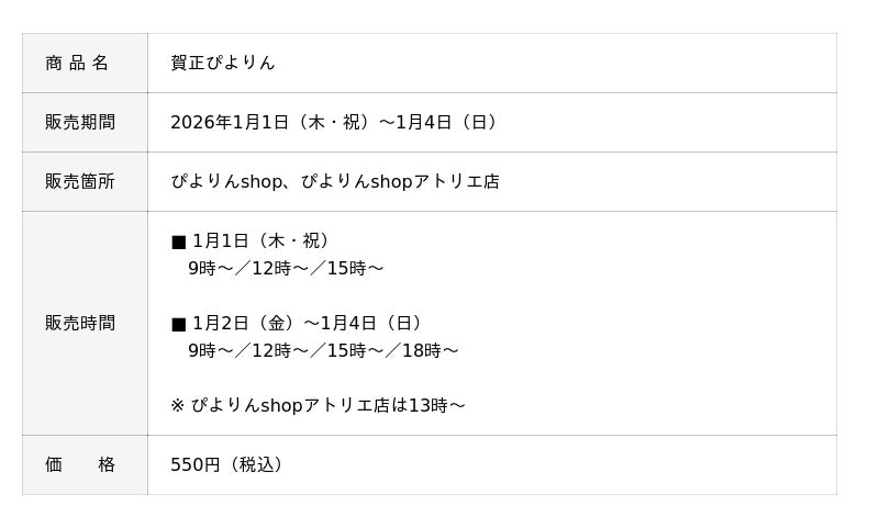 ジェイアール東海フードサービス株式会社(本社:愛知県名古屋市、代表取締役社長:岩下賢一)は、人気スイーツ「ぴよりん」の新春限定商品「賀正ぴよりん」を、2026年1月1日(木・祝)から1月4日(日)までの4日間限定で販売いたします。毎年ご好評をいただいている「賀正ぴよりん」は、新しい年の幕開けを祝う特別なぴよりん。新年のごあいさつやご自分へのごほうびにもぴったりな、晴れやかなひとときをお届けします。