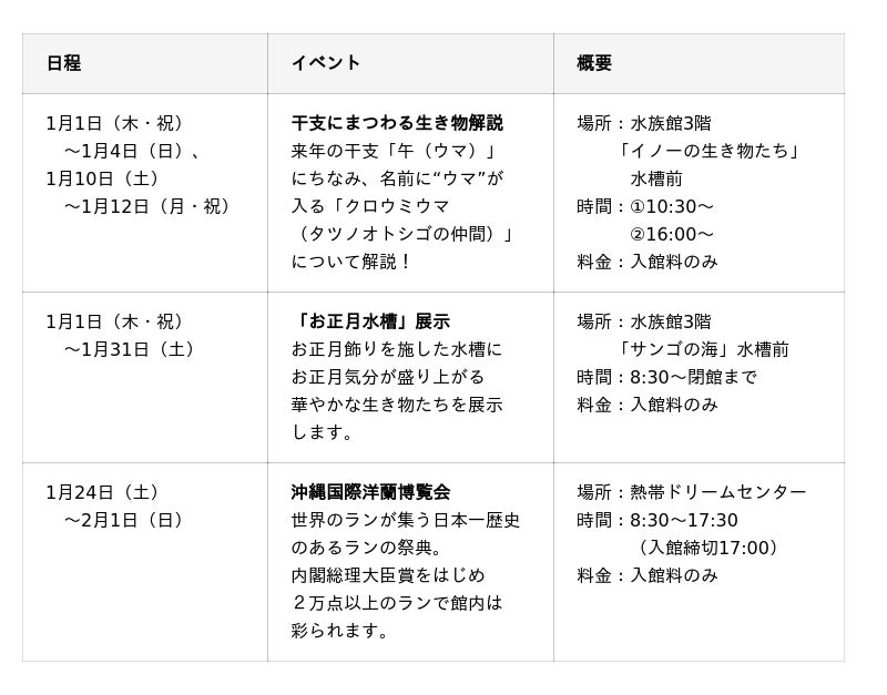 そのほか、美ら海花まつりや美ら海オトナ塾、お正月イベントなど、楽しいイベントが盛りだくさん!この機会にぜひ、家族みんなで海洋博公園にお越しください!