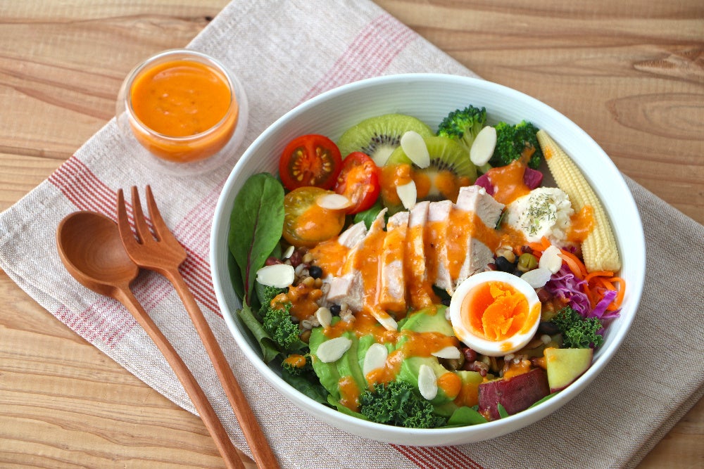 金時にんじんとアーモンドのドレッシングと蒸し鶏を使ったパワーサラダ