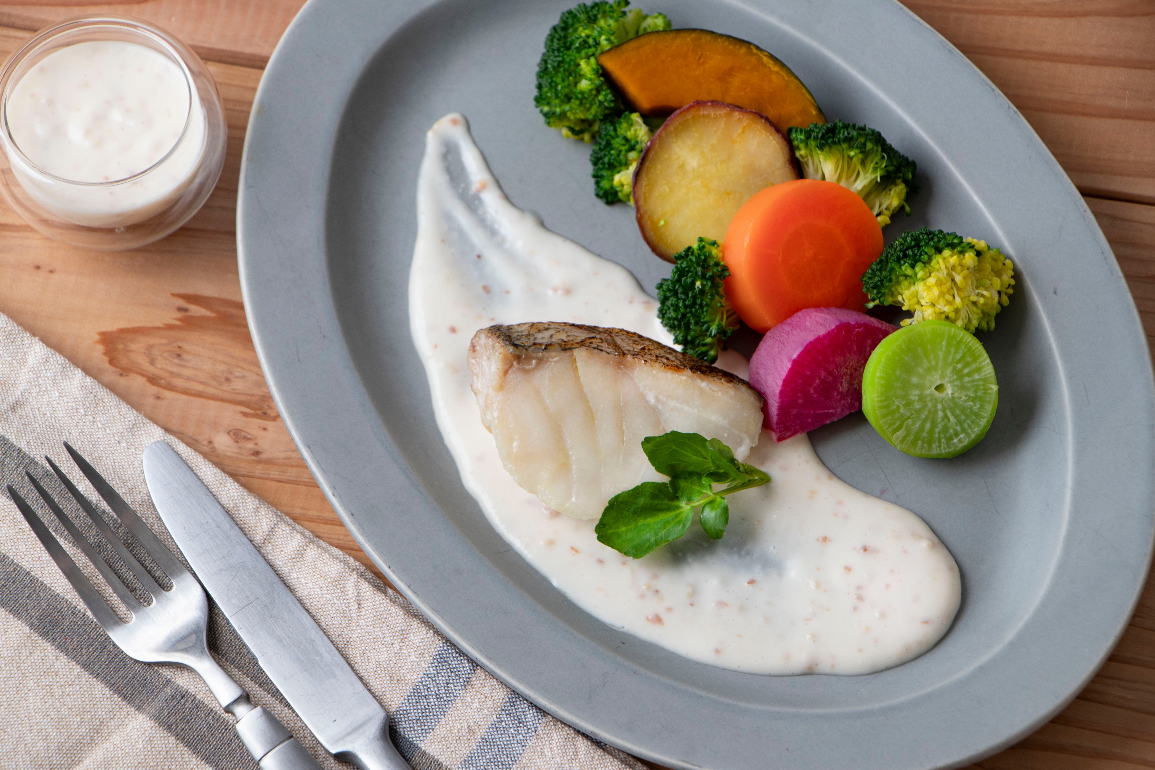 水尾の柚子とアーモンドのドレッシングと白身魚のポワレ温野菜添え
